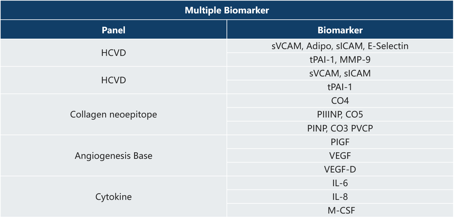 · CRP(ELISA,全验证) · AXL (ELISA,全验证) · IgE (ELISA,全验证) · hBD2 (ELISA,全验证) · sB7H3 (ELISA,全验证) · PARC (ELISA,全验证) · TARC (ELISA,全验证) · free VEGF (ELISA) · total VEGF (ELISA) | · GDF15 (ELISA) · VEGF-A (ELISA) · IFN-γ (ELISA,全验证) · DPPIV (Envision酶活性,全验证) · IFN-γ (MSD,全验证) · MCP-1 (MSD,全验证) · NFL (MSD,全验证) · Granzyme B (MSD,全验证) · Active GLP-1 (MSD,全验证) | · IL-12 (MSD,全验证) · IL-8 (MSD,全验证) · IL-15 (MSD,全验证) · IL-17A (MSD,全验证) · GM-CSF, IL-15 (MSD,全验证) · IL-6, TNF-α, IFN-γ (MSD,全验证) · IL-1β, IL-5, IL-6, IL-8 (MSD,全验证) · TNF-α, IL-2, IL-4, IL-6, IL-10 (MSD,全验证) · IFN-γ, IL-1β, IL-2, IL-4, IL-6, IL-8, IL-10, IL-12p70, IL-13, TNF-α (MSD,全验证) |