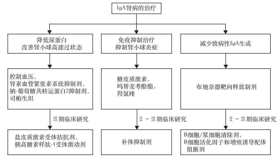 IgAN治疗方案包括:减少致病形式Gd-IgA1、减少IgA免疫复合物的形成、减少免疫复合物介导的肾小球损伤和控制IgA肾病引起的肾单位丢失。