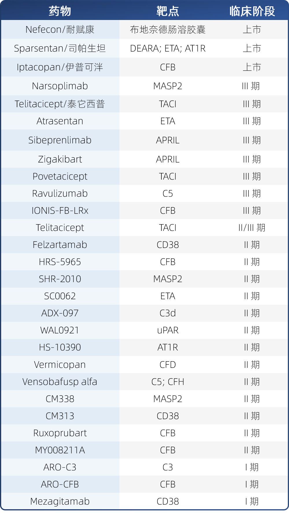 目前多项IgA肾病新药与获批上市和临床试验开展中,包括针对IgA肾病治疗的新途径,例如B细胞调节(TACI、APRIL、CD38)和抑制补体途径(CFB、MASP2、C5、C3),也包括针对IgA肾病诱导的肾单位丢失管理的ETA/AT1R拮抗剂及ETA拮抗剂。目前耐赋康(Nefecon)和伊普可泮(Iptacopan,CFB)已获FDA和NMPA批准上市,司帕生坦(Sparsentan,DEARA)已获FDA批准上市。泰它西普(Telitacicept,TACI)拟纳入优先审评,Atrasentan(ETA)已申报上市,Zigakibart (APRIL)、HR19042 、Sibeprenlimab、瑞利珠单抗(C5)、IONIS-FB-LRx(CFB ASO)均处在国内临床三期中。