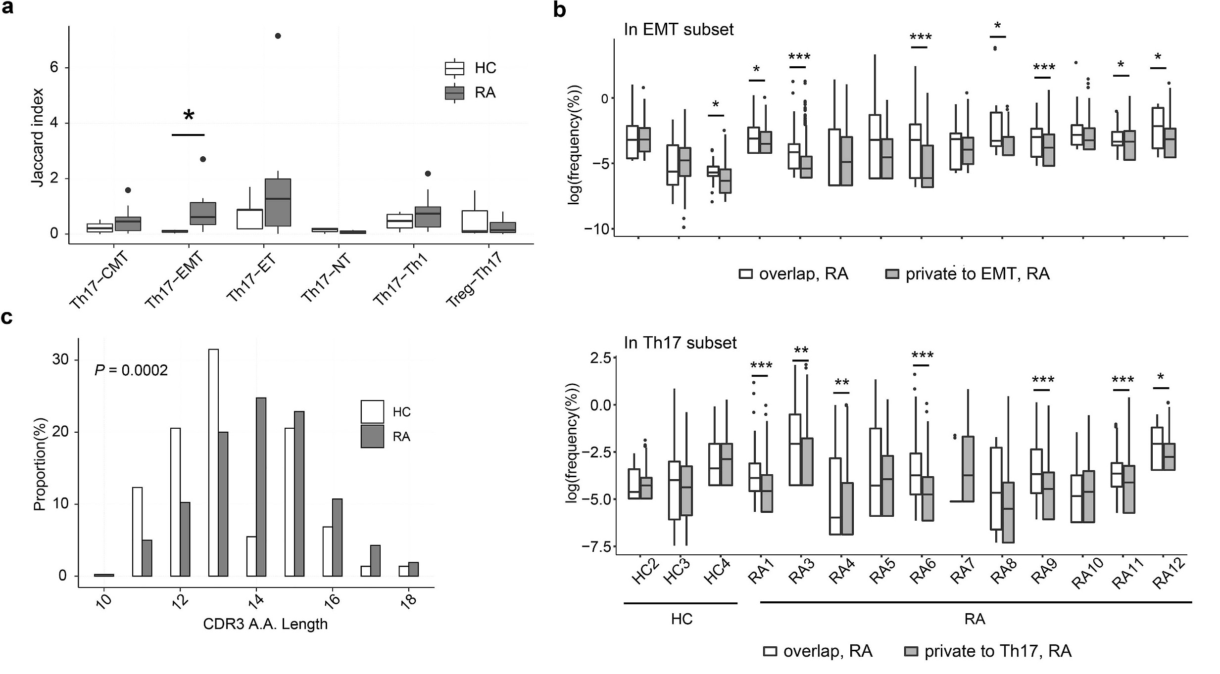 注:(a)计算Th17和其他亚群之间的Jaccard指数,与健康对照(hc)相比,RA患者Th17和EMT细胞的CDR3s表现出更多的相似性;(b)在RA中,EMT(上)和Th17(下)克隆型的重叠频率高于私有克隆型;(c)RA和HC重叠克隆型长度分布,RA重叠克隆型明显长于HC重叠克隆型