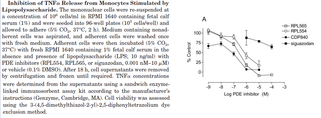 如上图所示,Ensifentrine(研发代号PRL554)的早期研发阶段使用LPS刺激人单核细胞,通过检测药物对人单核细胞分泌TNFα浓度的影响来评估PRL554的药物活性。该模型虽然已经采用了人来源的单核细胞来预测在人体的药效活性,但相对于人全血模型来说,仍然缺失复杂的基质与细胞相互作用。