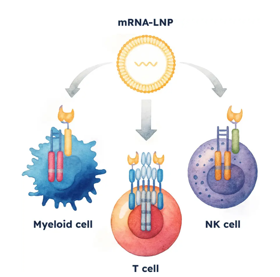 虹信生物(MagicRNA)抗CD19 CAR的CD8-tLNP(HN2301)已推进至临床阶段。其Enc-LNP平台包含专有的抗体片段和可电离脂质。临床前证据显示,在人CD8转基因狼疮肾炎模型中,替代抗CD19 CAR具有活性;非人灵长类动物中,在输注抗CD20 CAR替代产品中观察到“免疫重置”的迹象。研究者发起的临床试验正在评估HN2301治疗复发难治性系统性红斑狼疮患者的安全性、疗效及平台的广泛适用性。该方法已证实可在体内工程化抗CD19 CD8+ CAR-T细胞,同时观察到B细胞耗竭、与靶向活性相关的细胞因子产生,以及系统性红斑狼疮患者自身抗体滴度降低所体现的临床相关生物标志物活性。今年9月发表的文章中披露,5例患者接受体内HN2301后,不良事件均为1–2级,未观察到3–4级毒性。每剂 HN2301 输注后 6 h 出现尖峰(最高约 60–80 %),随后 48–72 h 回落至基线。在接受首次治疗后的 6 小时内,接受 2 毫克剂量治疗的患者(患者 1 和 2)循环 B 细胞显著减少,而接受 4 毫克剂量治疗的患者(患者 3、4 和 5)循环 B 细胞则完全耗尽(每微升少于 1 个 B 细胞),且这种耗尽状态一直持续到给药后 7-10 天。在最后一次随访(治疗 3 个月后),所有 5 名患者的系统性红斑狼疮疾病活动指数 2000 评分均有所下降,表明他们的疾病活动度降低。近日,虹信生物获得腾讯的入股。